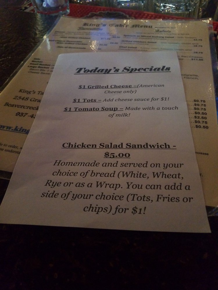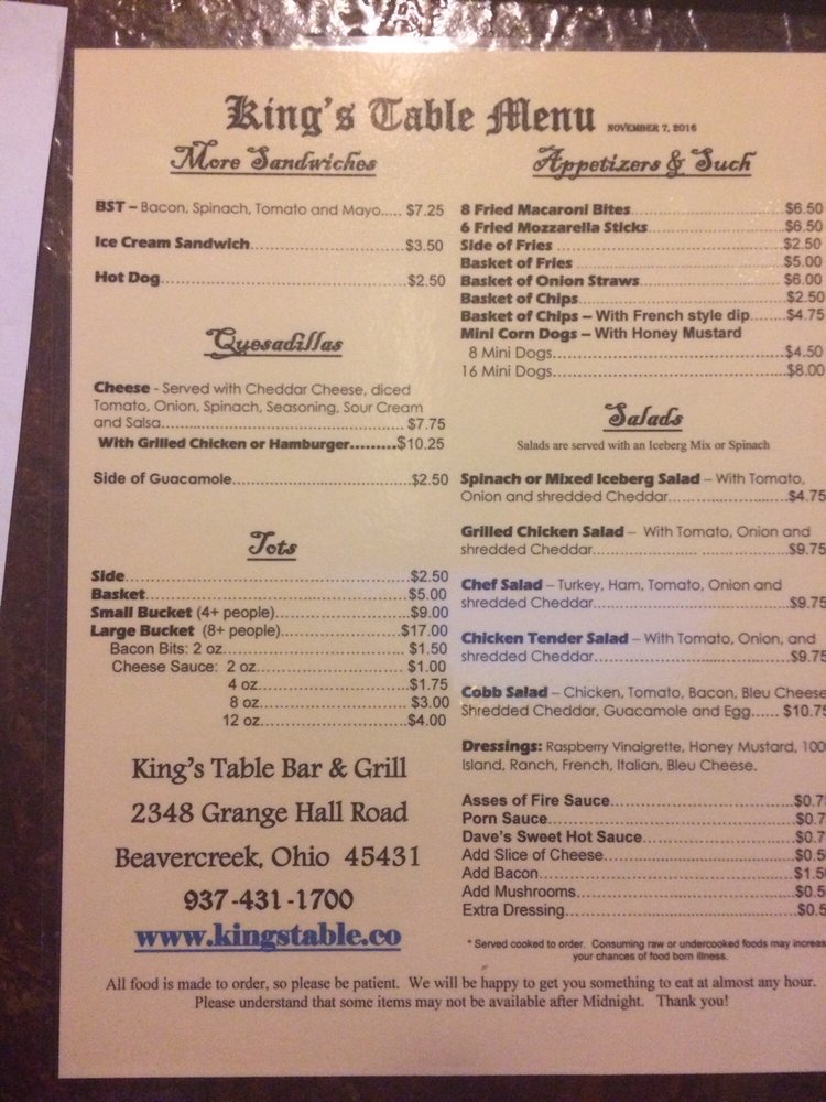 Introducing Kings Table, a beloved American bar offering a diverse menu with many vegetarian options. Located in Dayton, Ohio, this establishment is known for its friendly staff, great specials, and assortment of draft beers. The menu features signature items like the 6.25-ounce Burger, Turkey Club Sandwich, and Grilled Chicken Salad. Customers rave about the excellent service and welcoming atmosphere, perfect for business meetings or special events. With pool tables, dart boards, and trivia nights, Kings Table provides a fun and lively experience for all. Dive into the flavorful dishes and enjoy the family-friendly vibe at Kings Table.